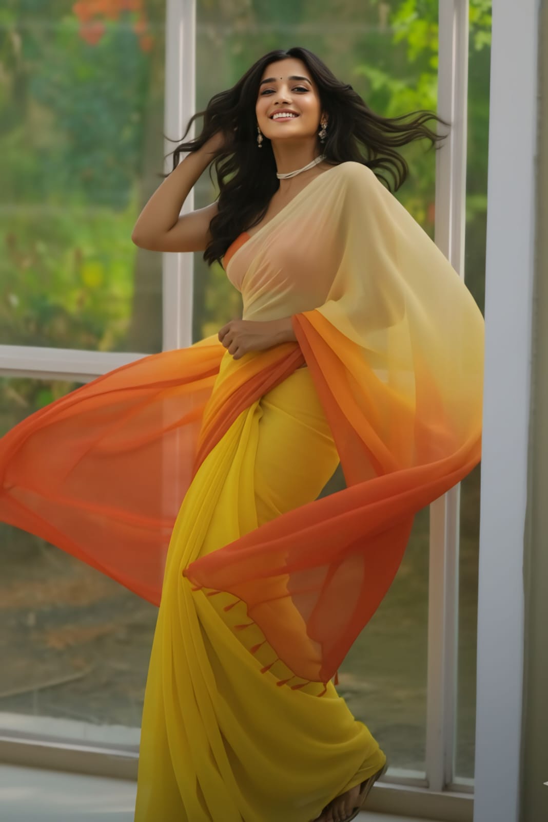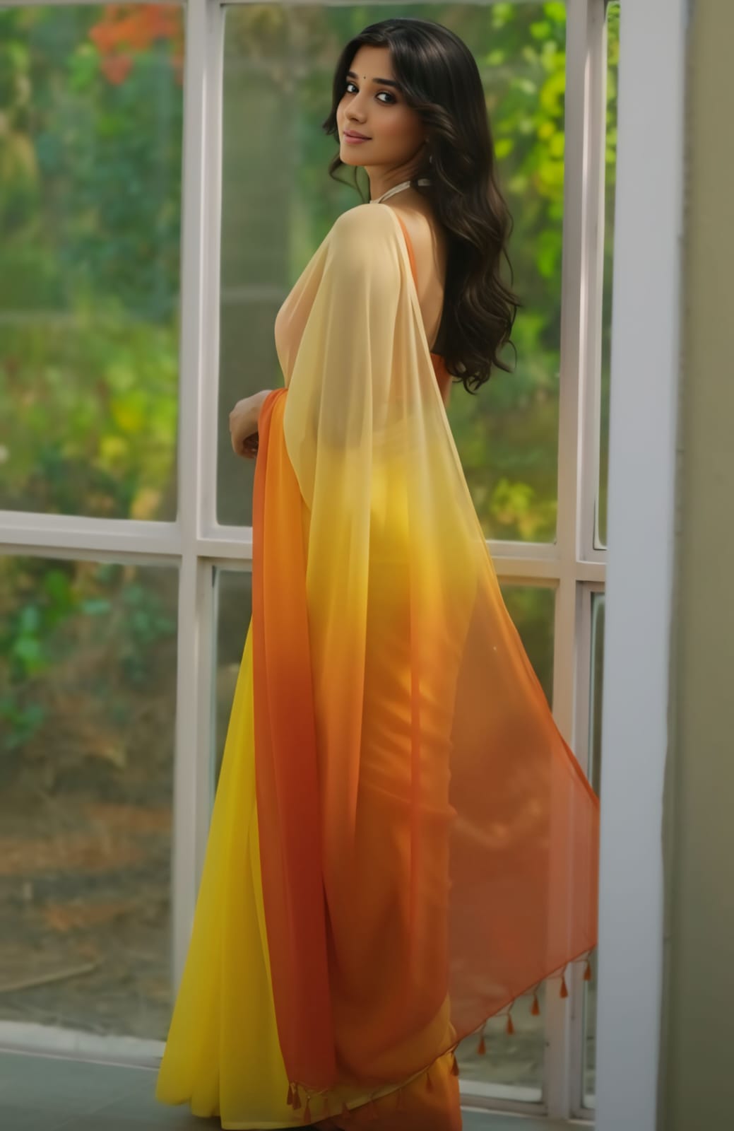 New Beautiful Yellow and Orange Ombre Georgette delicate Saree with un – Divashree index
