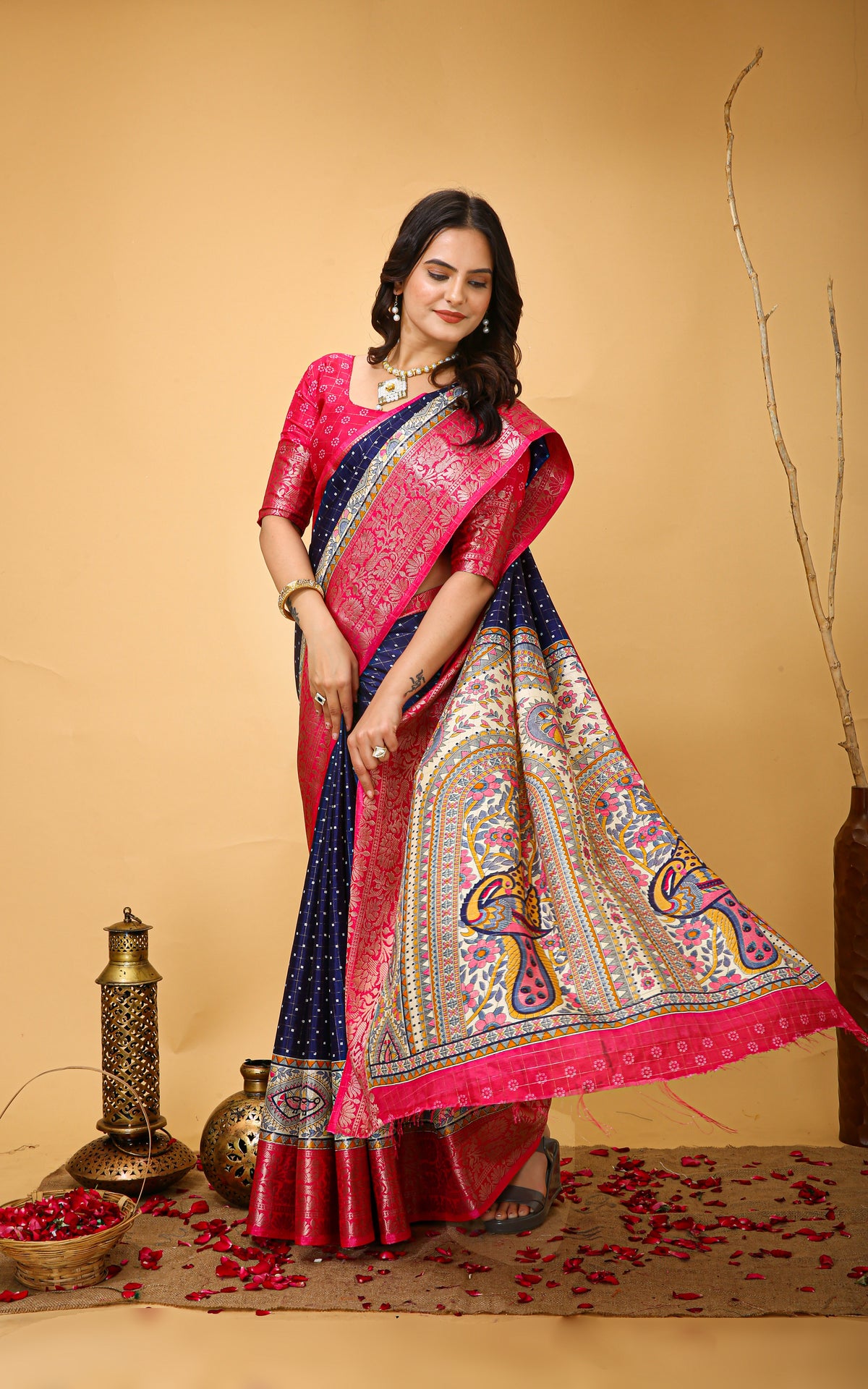 New Enchanting soft cotton Dot Printed Navy Blue Saree With Unstiched Blouse