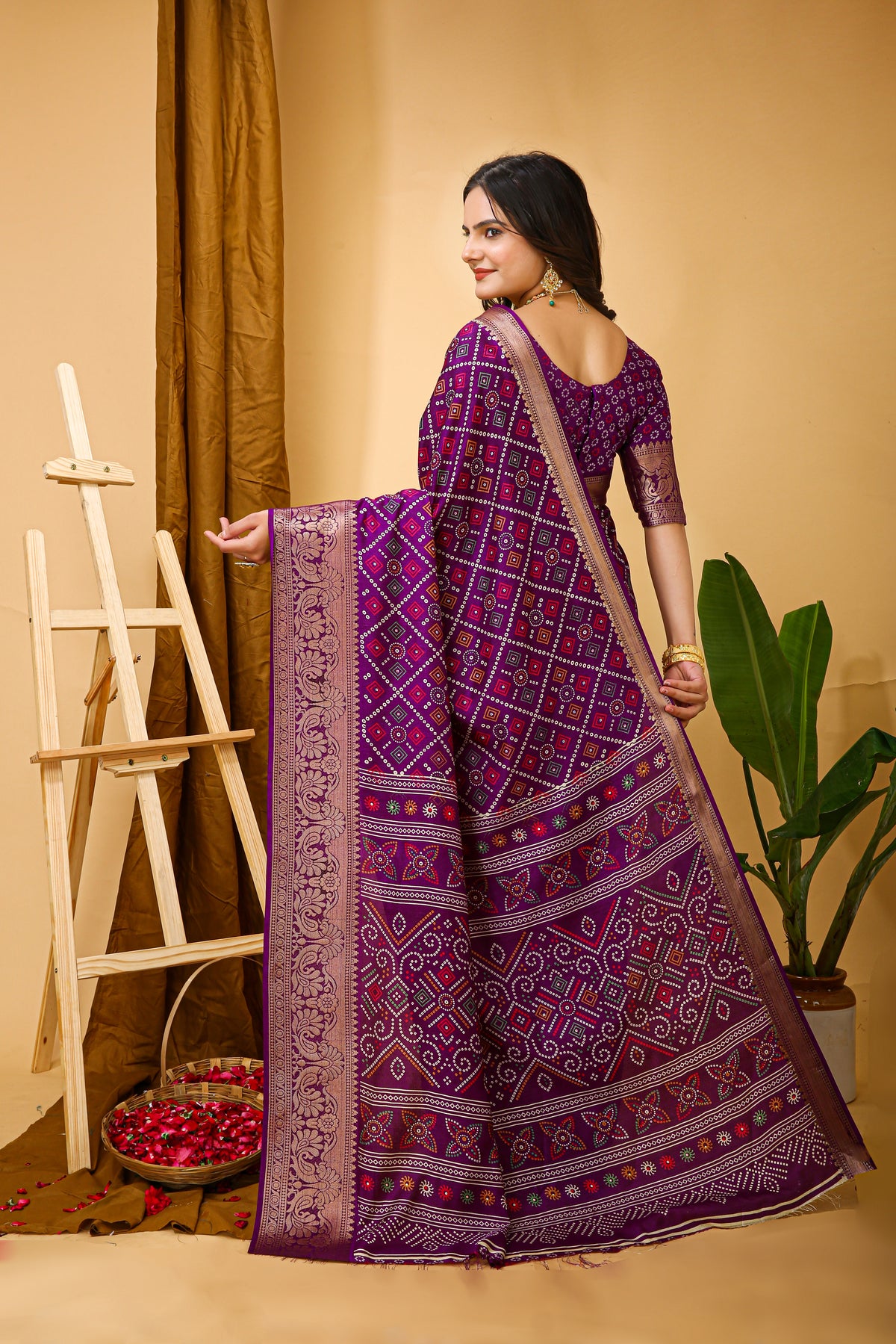 Product Name: New Enchanting soft cotton Bandhani Printed Violet Saree With Unstiched Blouse