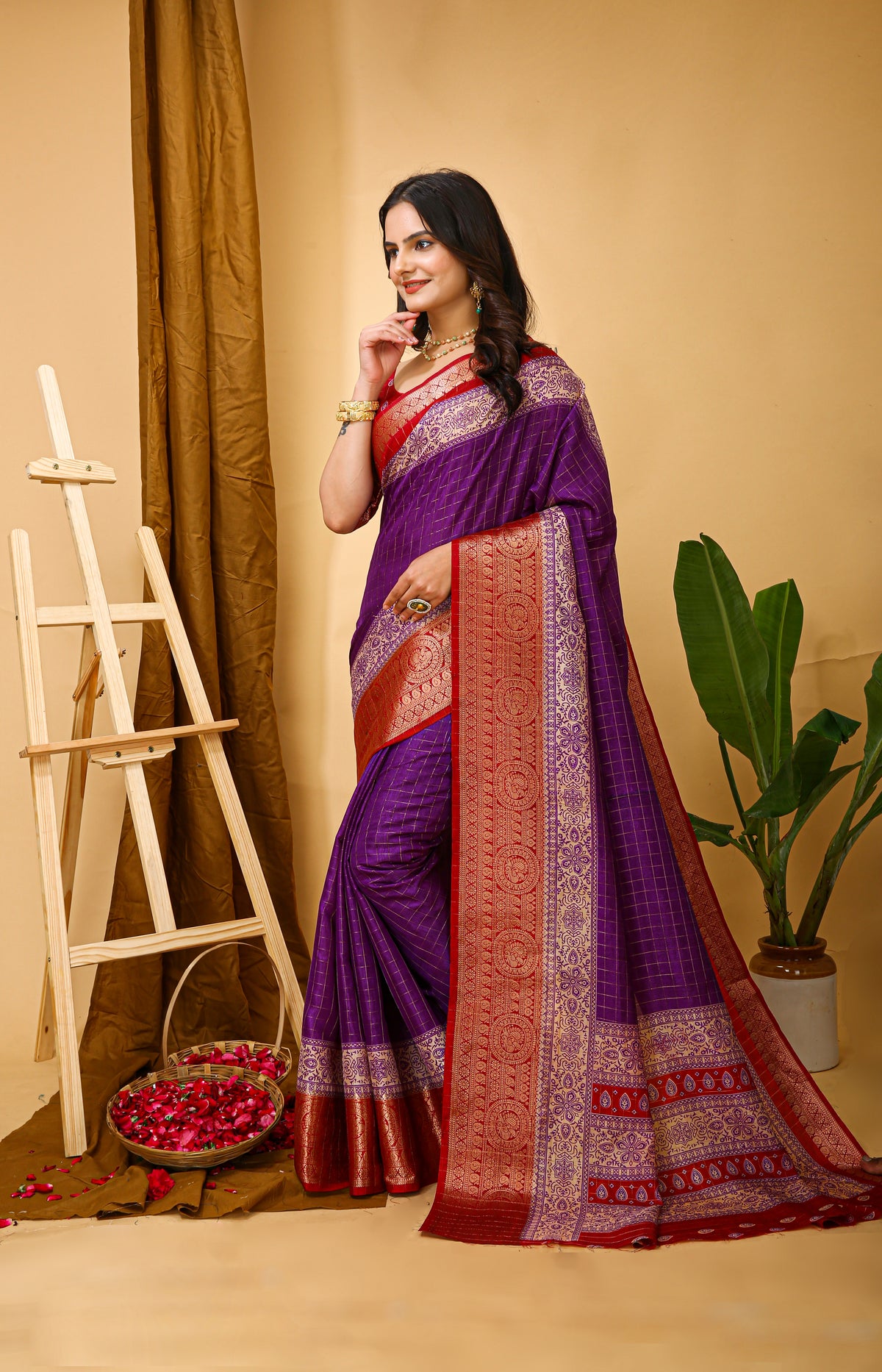 New Enchanting Soft Cotton Checks Printed Violet Saree With Unstiched – Divashree index