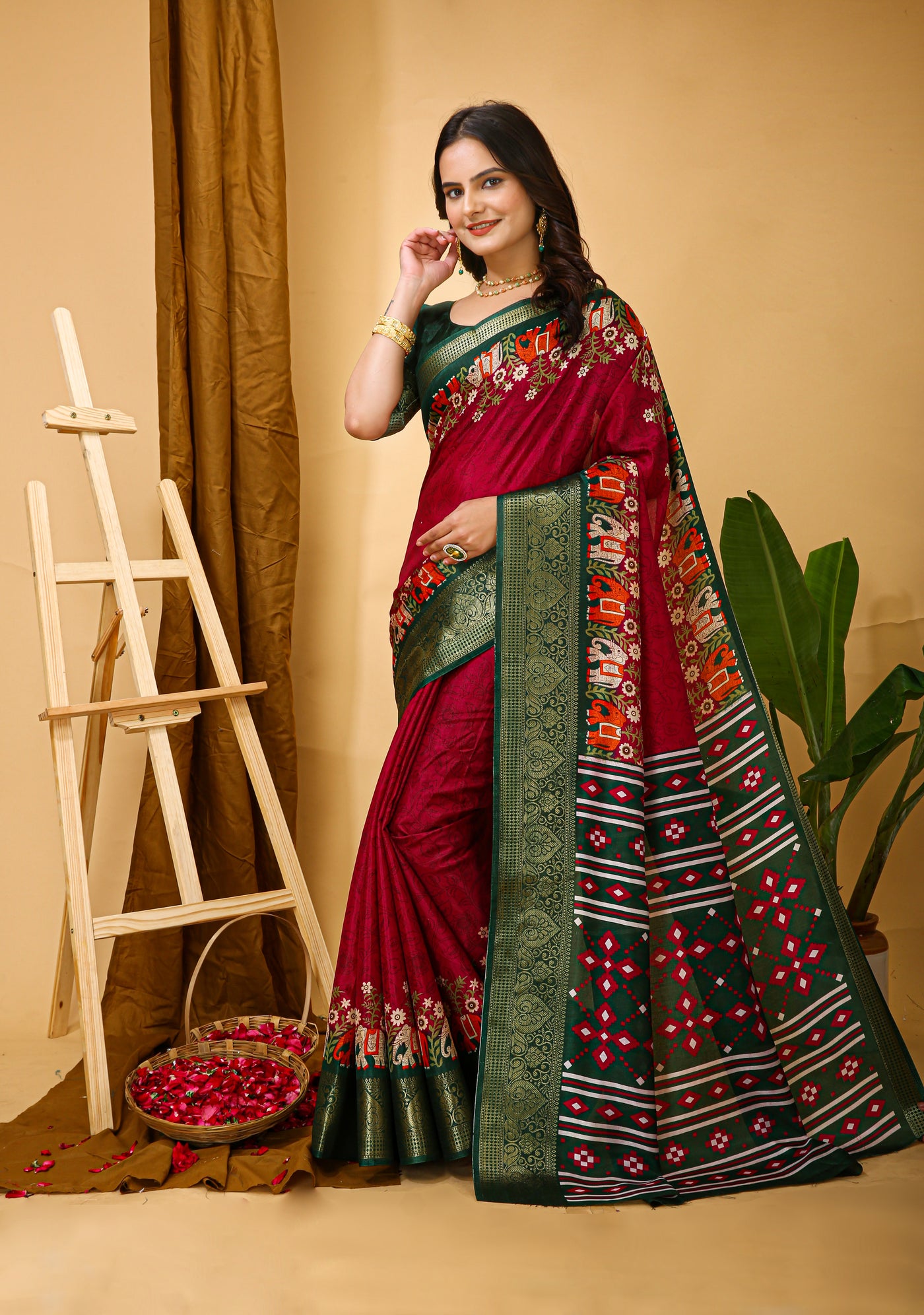 Product Name: New Enchanting soft cotton Traditional Elephant Printed Maroon Red Saree With Unstiched Blouse