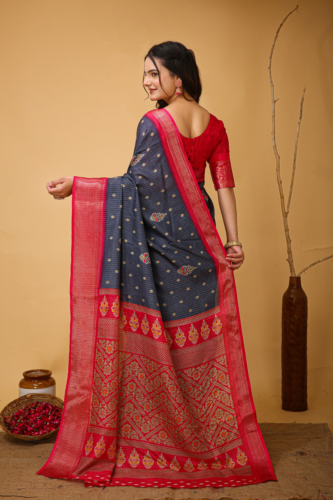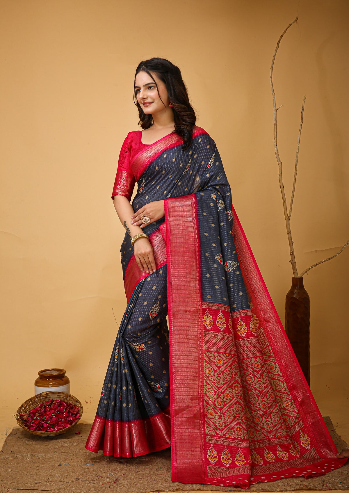 Product Name: New Fancy Kalamkari Print And Jecard Kanjivaram Zari Border Soft Cotton Grey Saree With Unstiched Blouse