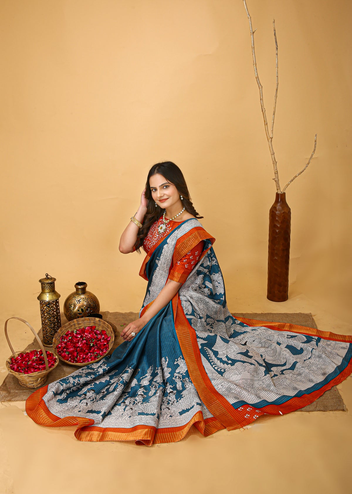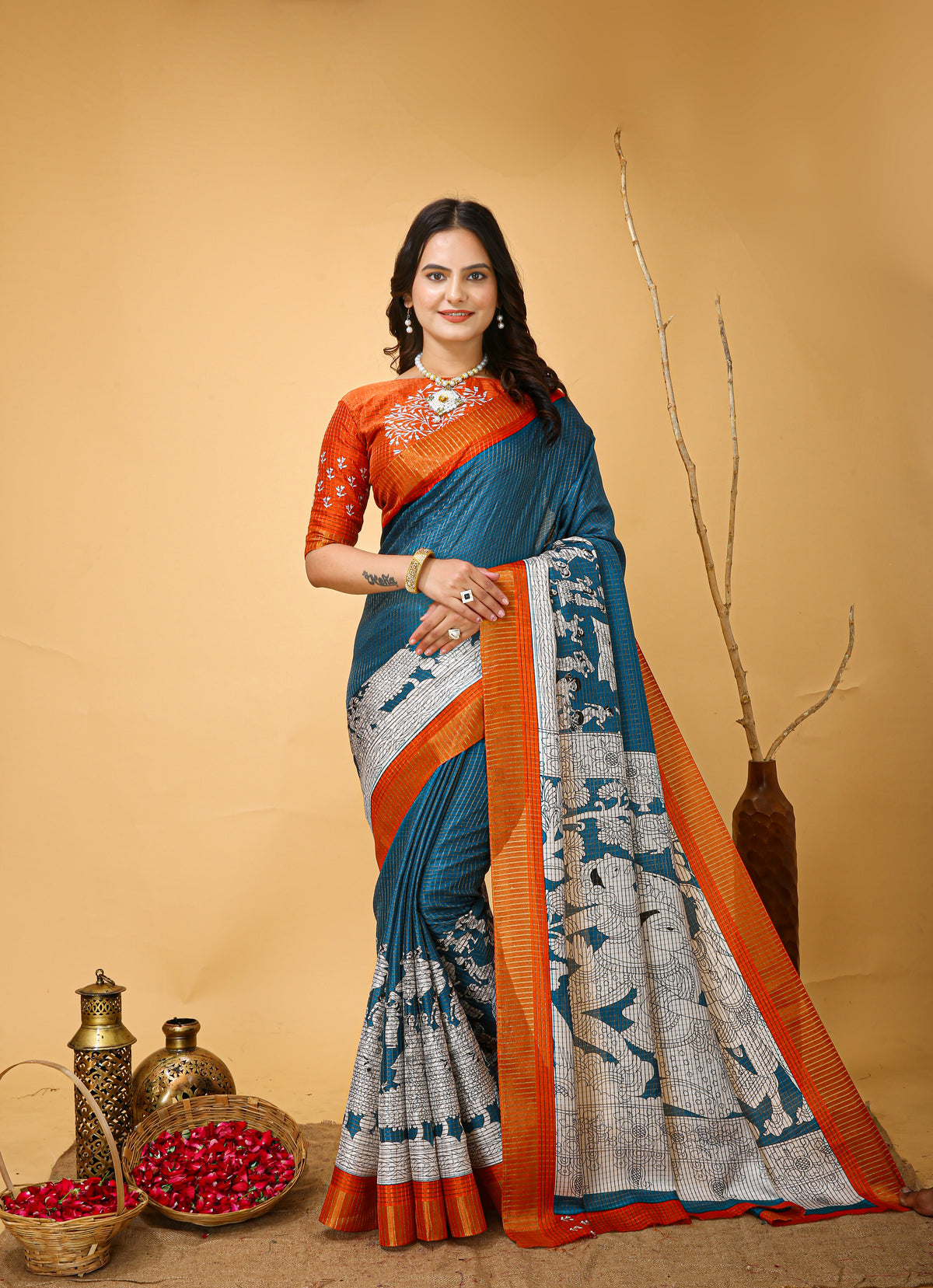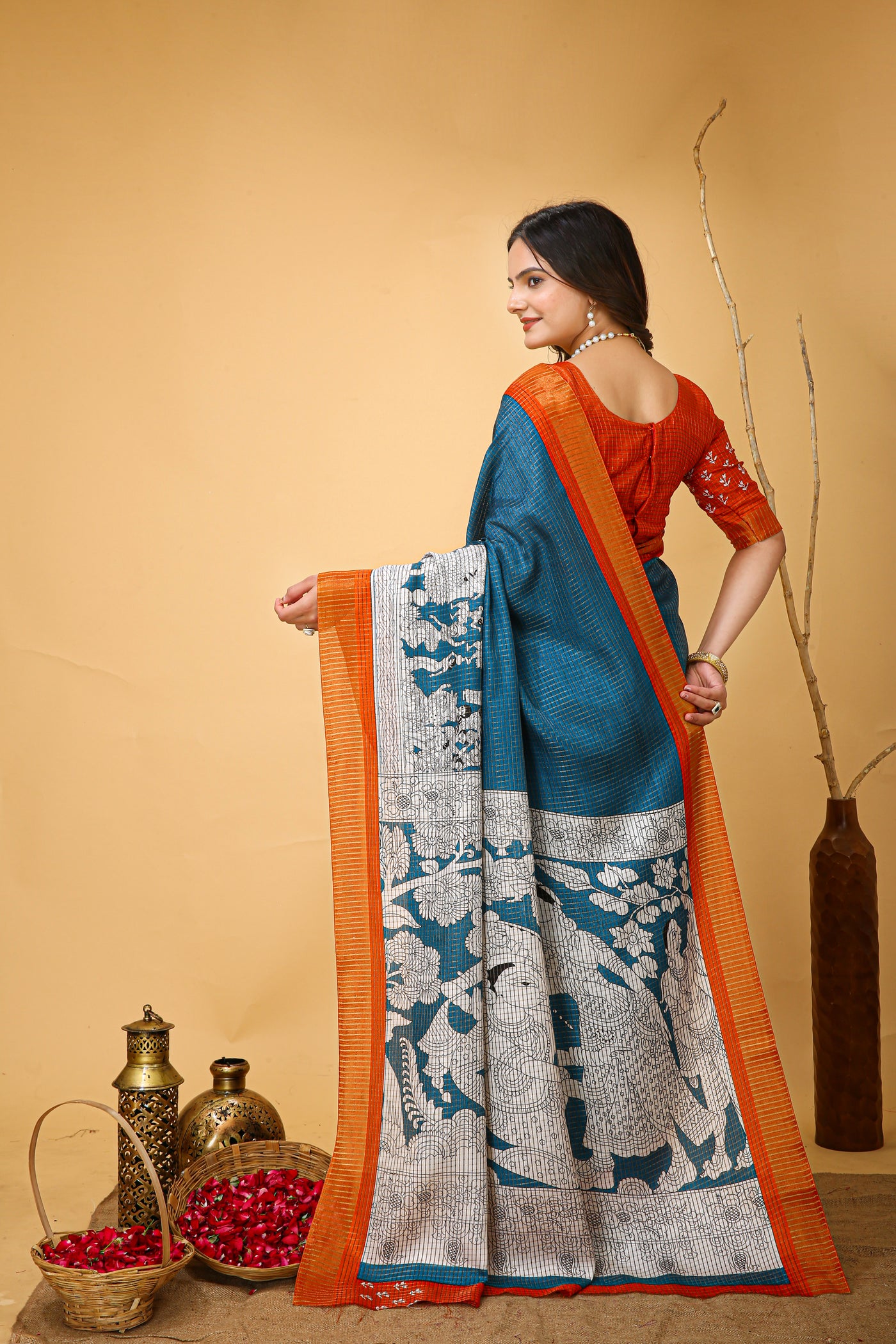 Product Name: New Fancy Kalamkari Print And Jecard Kanjivaram Zari Border Soft Cotton Greyish Blue Saree With Unstiched Blouse
