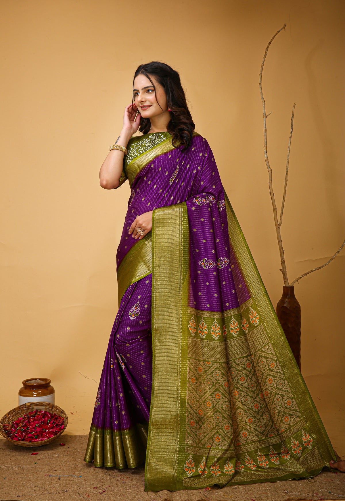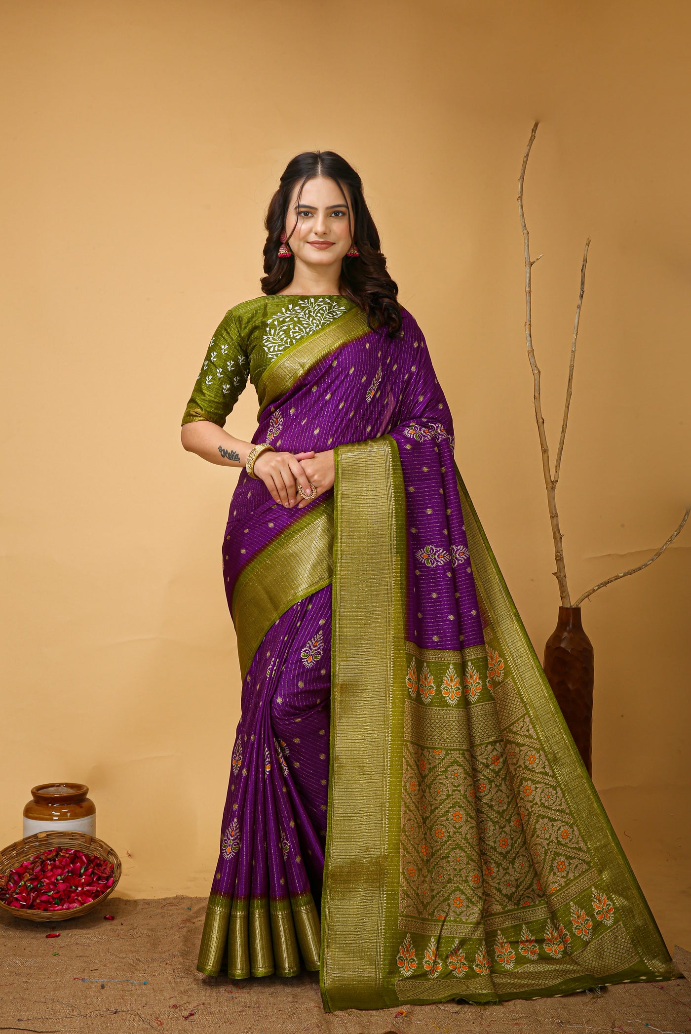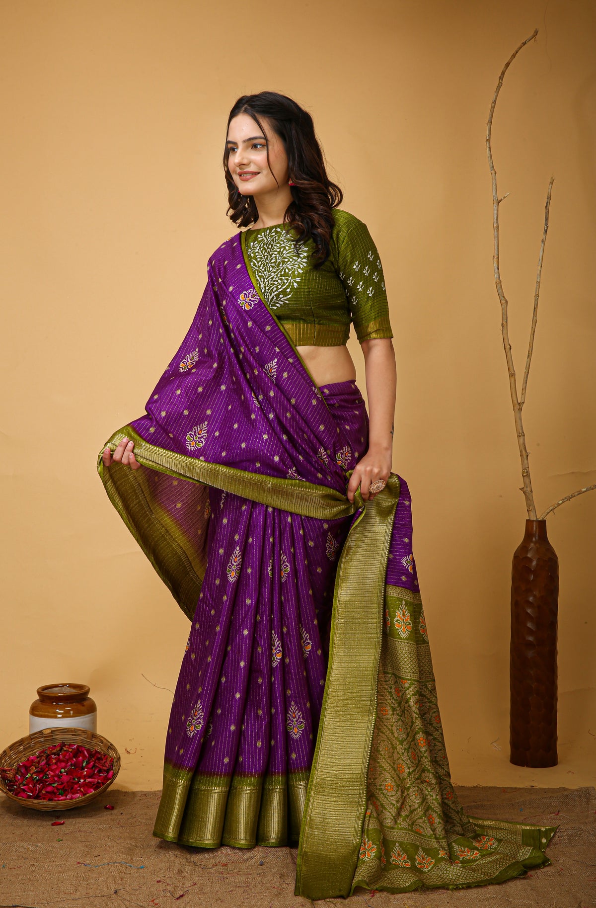 Product Name: New Fancy Kalamkari Print And Jecard Kanjivaram Zari Border Soft Cotton Dark Purple Saree With Unstiched Blouse