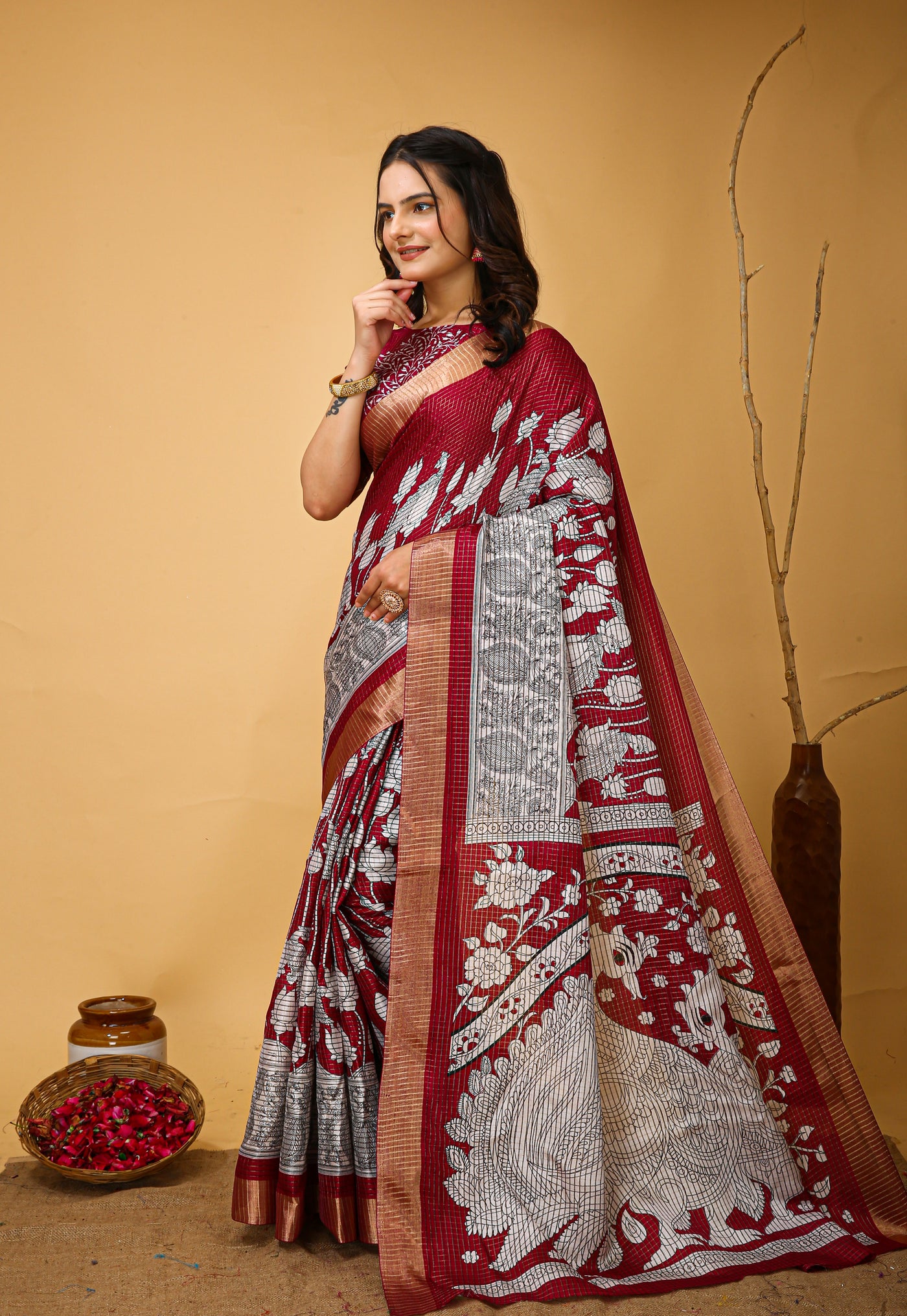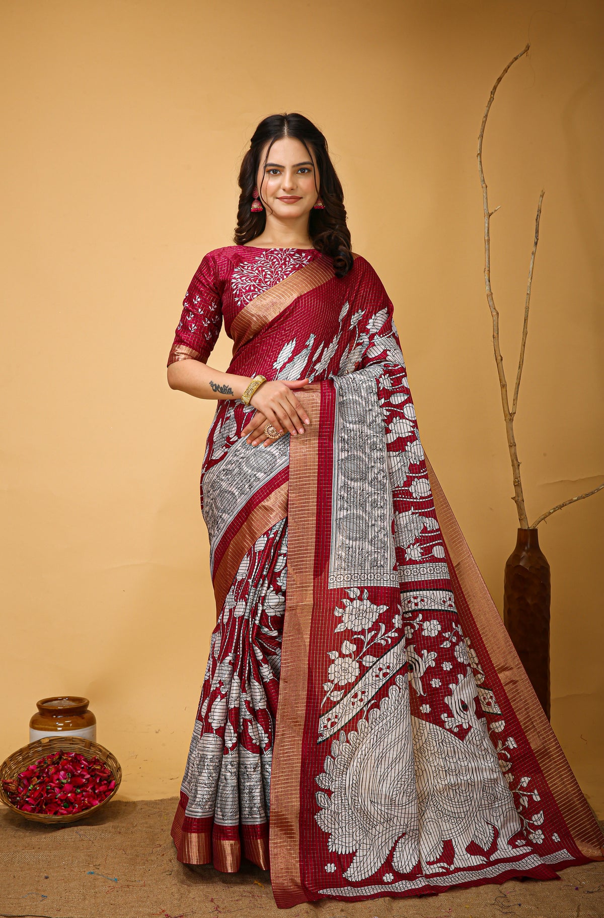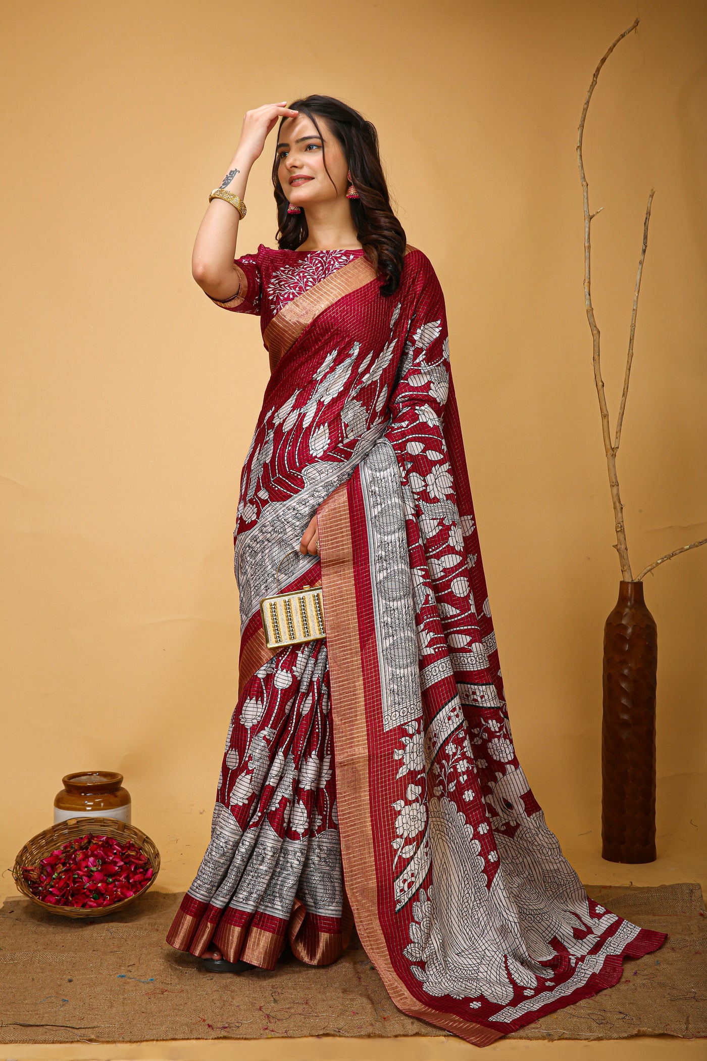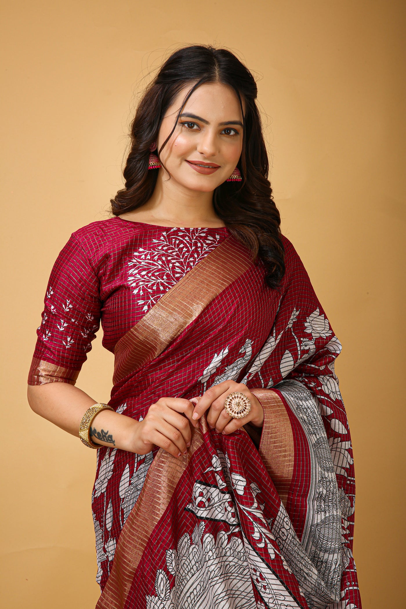 Product Name: New Fancy Kalamkari Print And Jecard Kanjivaram Zari Border Soft Cotton Maroon Red Saree With Unstiched Blouse