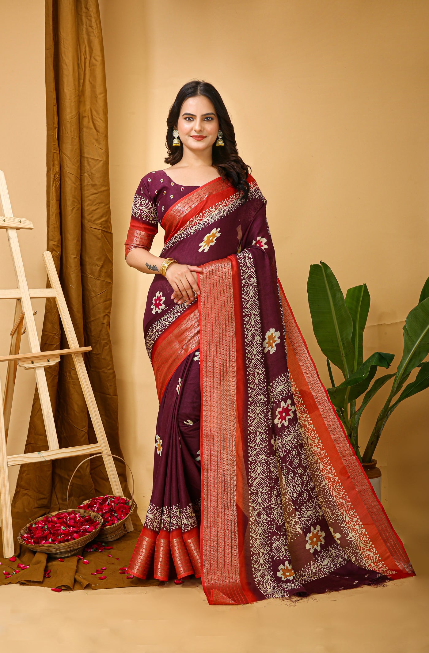 New Enchanting Fancy Soft Marshmallow Red Bodered Wine Saree With Unstiched Blouse