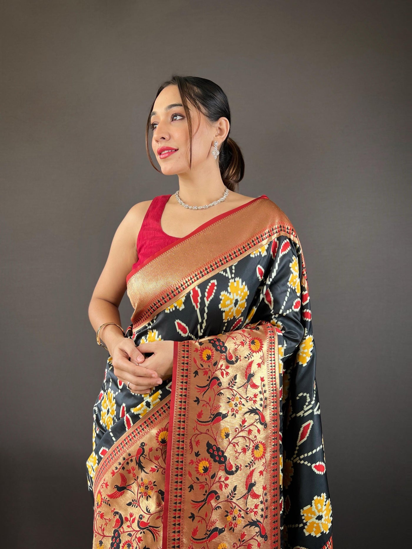 Product Name: New Designer Premium Soft Silk Patola Weaved Black Saree With Unstiched Blouse Piece