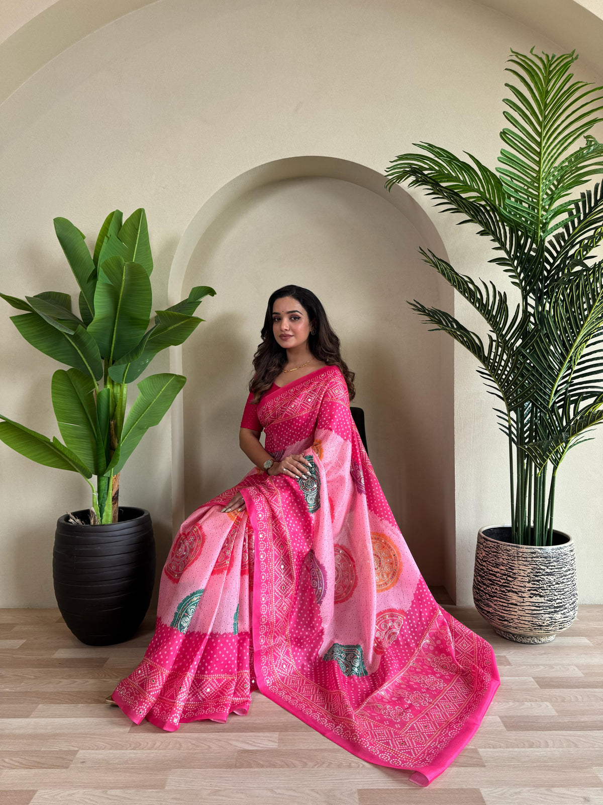 Product Name: New Designer Tissue Silk Weaving Dual Pink Shade Saree With Contras Printed Embroidery Work Unstiched Blouse Piece