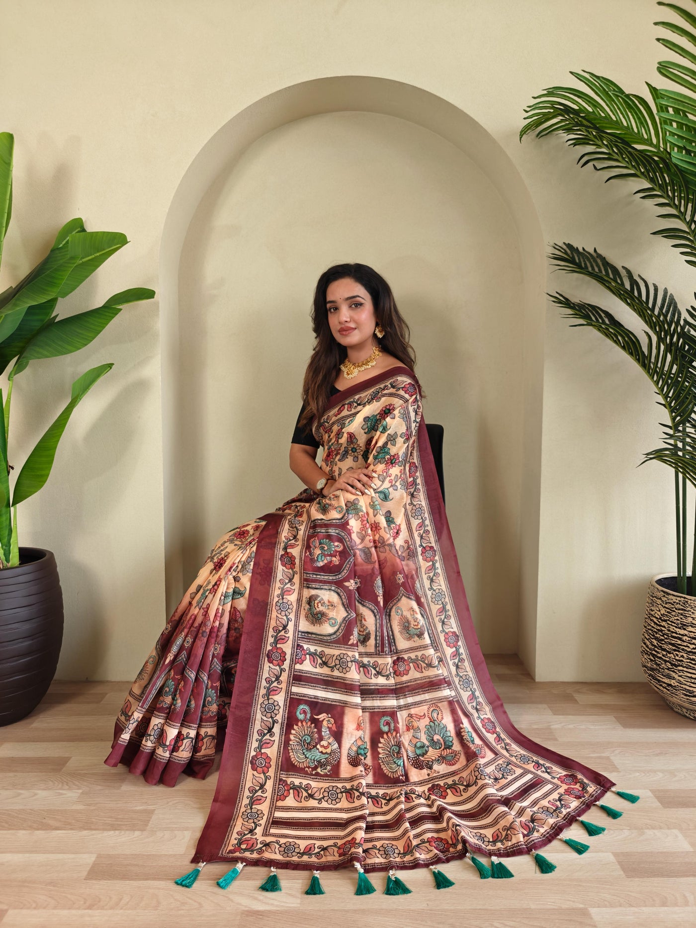 Product Name: New Designer Pure Malai Cotton Saree With Elephant Kalamkari Pattern Along With Contras Big Pallu With Tussels - Cream