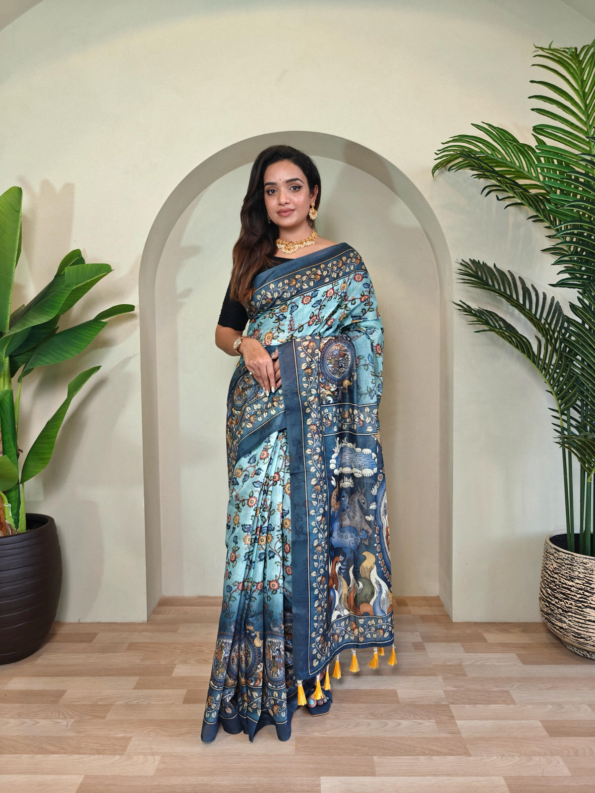 New Designer Pure Malai Cotton Saree With Elephant Kalamkari Pattern Along With Contras Big Pallu With Tussels - Blue