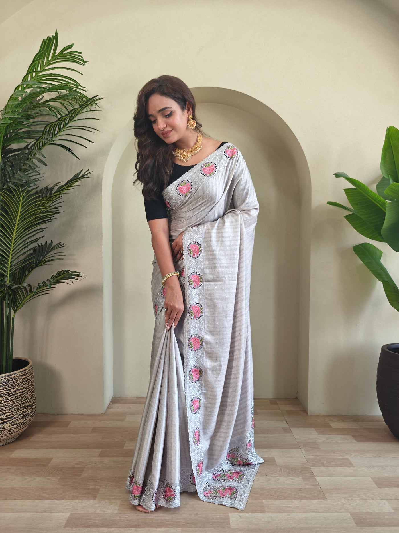 Product Name: New Designer Soft Tussur Silk Grey Saree With Super Fine Embroidered Pattern With Running Unstiched Blouse Piece
