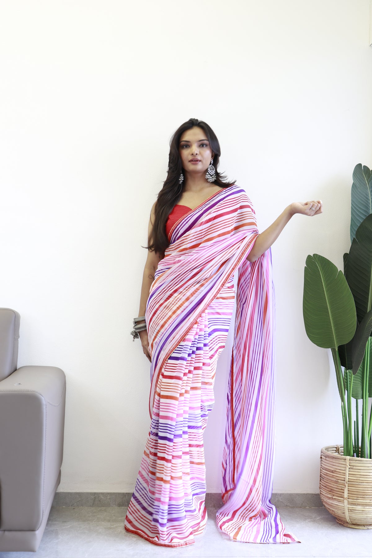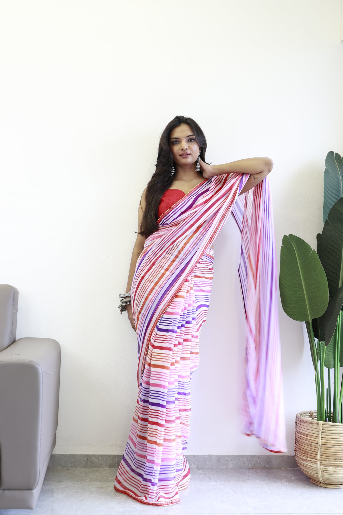 Product Name: New One Minute Ready Wear Pink Multicolor Strip Saree