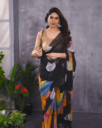 Product Name: New One Minute Ready To Wear Pure Soft Georgette Silk Flower Designed Black Saree With Same Model Unstiched Blouse Piece