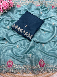 New Designer Blooming Chocolate Silk Saree With Multi Embroidery work - Ocean blue