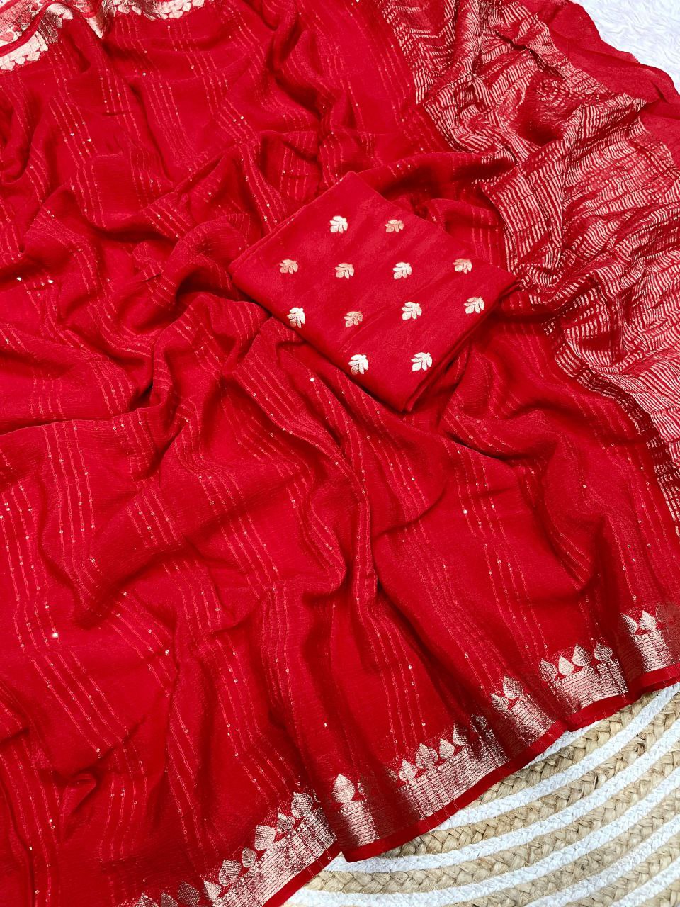Product Name: New Designer Pure Chinnon Chiffon Silk Saree - Red