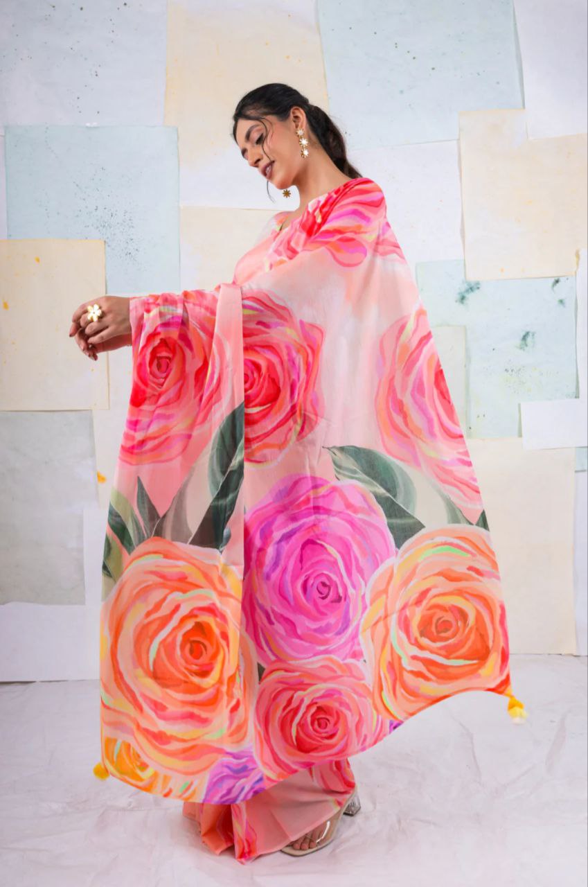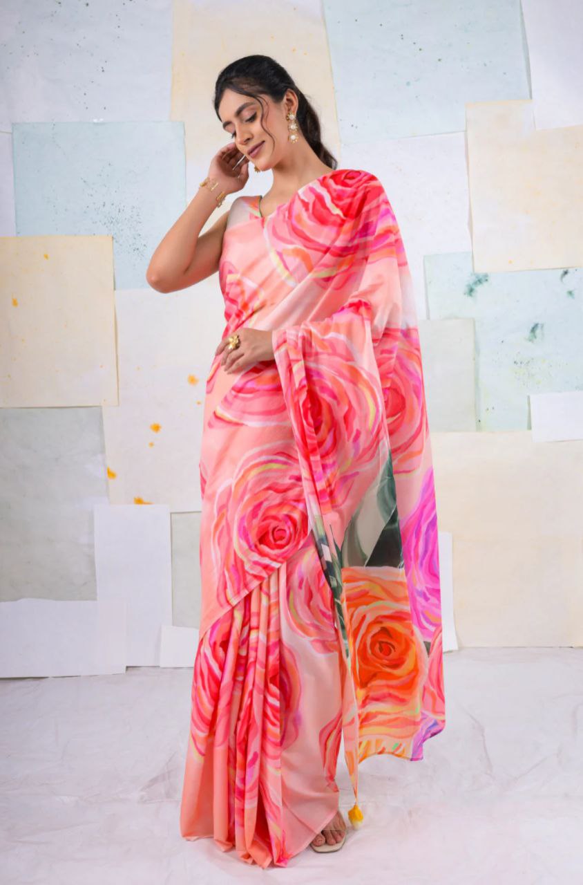 New Designer Original Japan Satin Rose Flower Printed Peach Saree With Digital Printed Unstiched Blouse Piece
