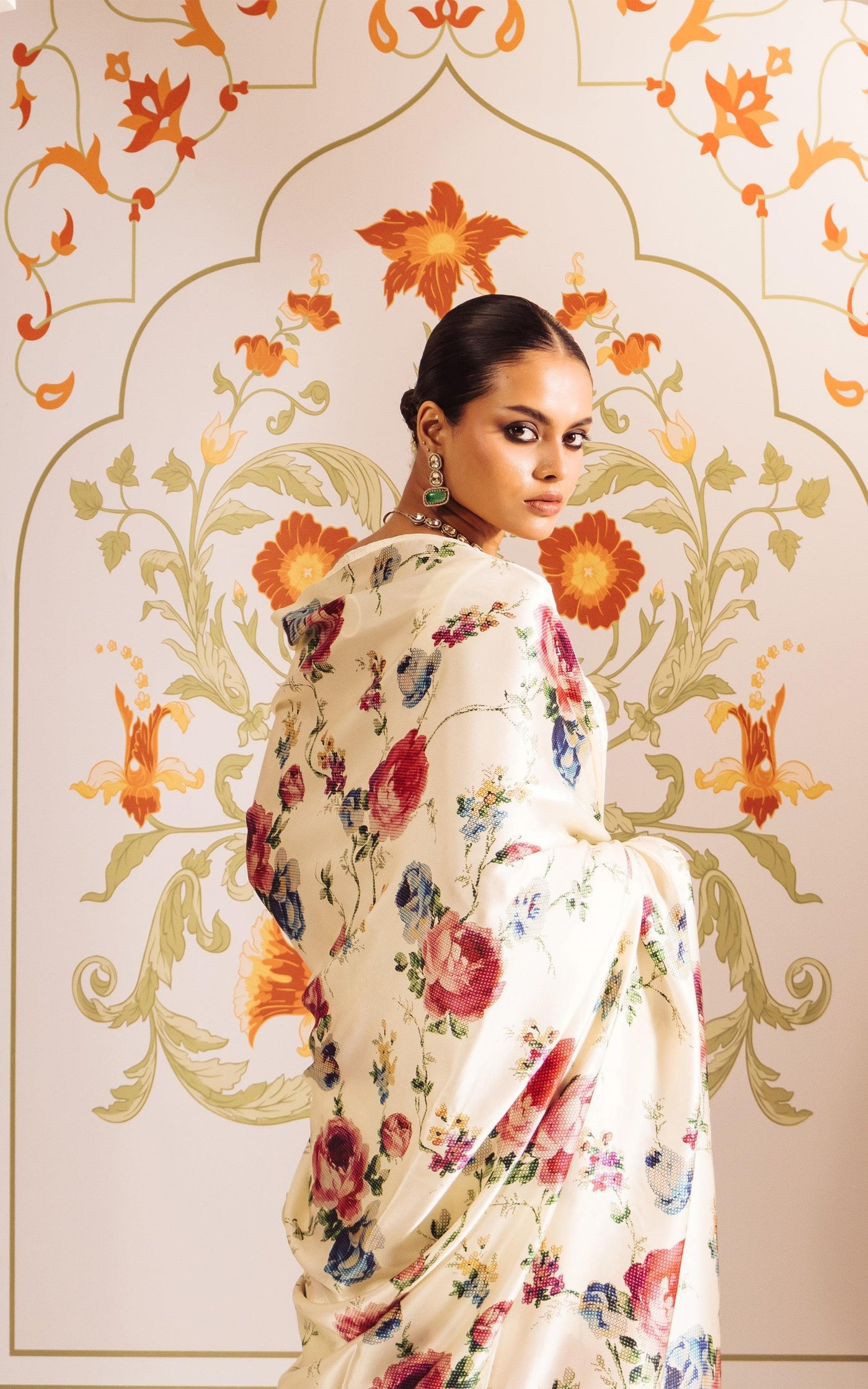 New Premium Japan Satin Digital Printed Designer Off White Saree With – Divashree index