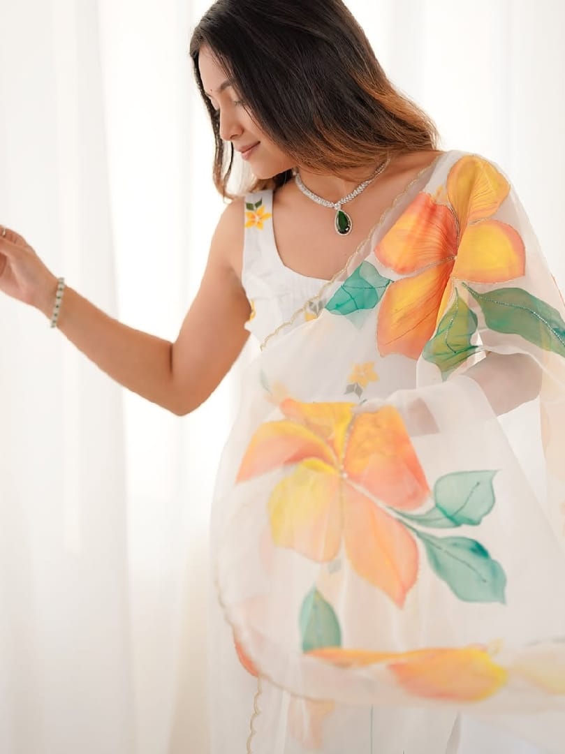One Minute Ready To Wear Pearl White Blossom Saree With Same Colour Flower Design Organza Silk Full Stitched Blouse