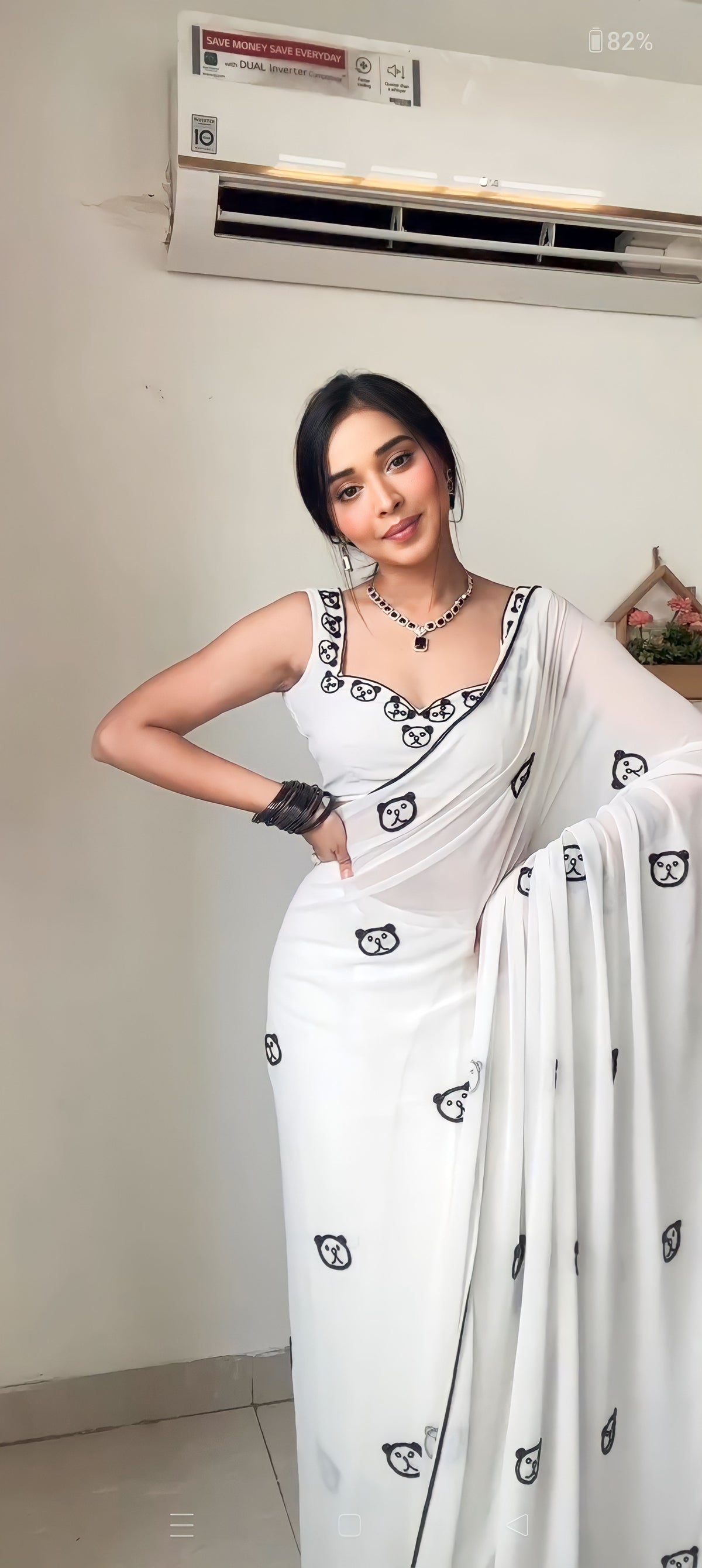 Product Name: New One Minute Ready Wear Bear Printed White Georgette Saree