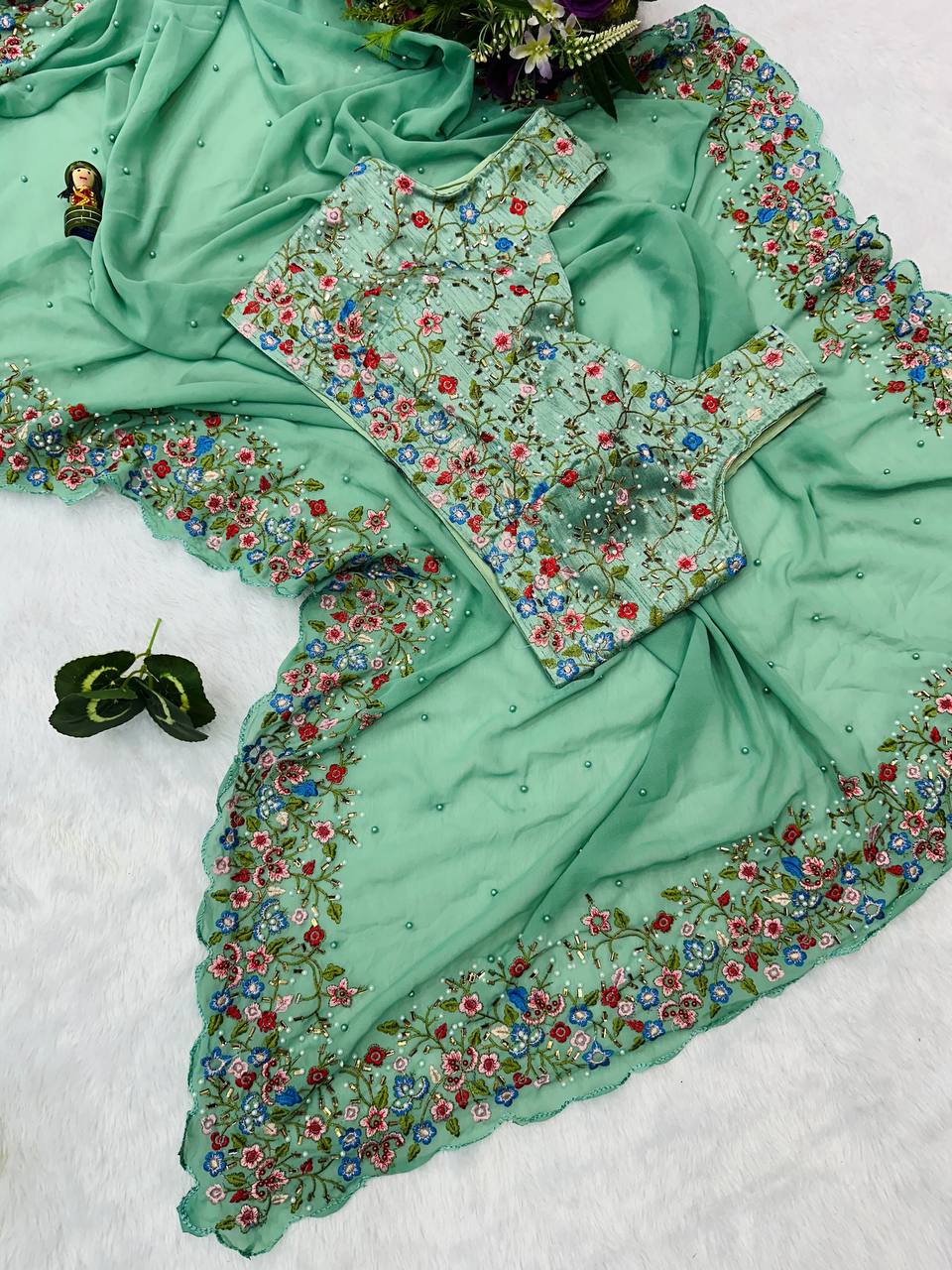 New Primiume Quality Faux Georgette Embroidered Work Cut and Hand Work Border Saree